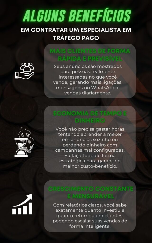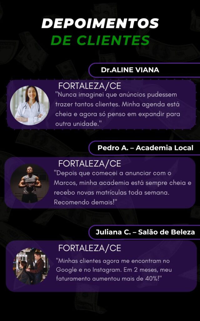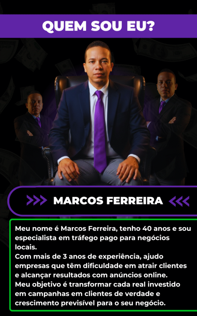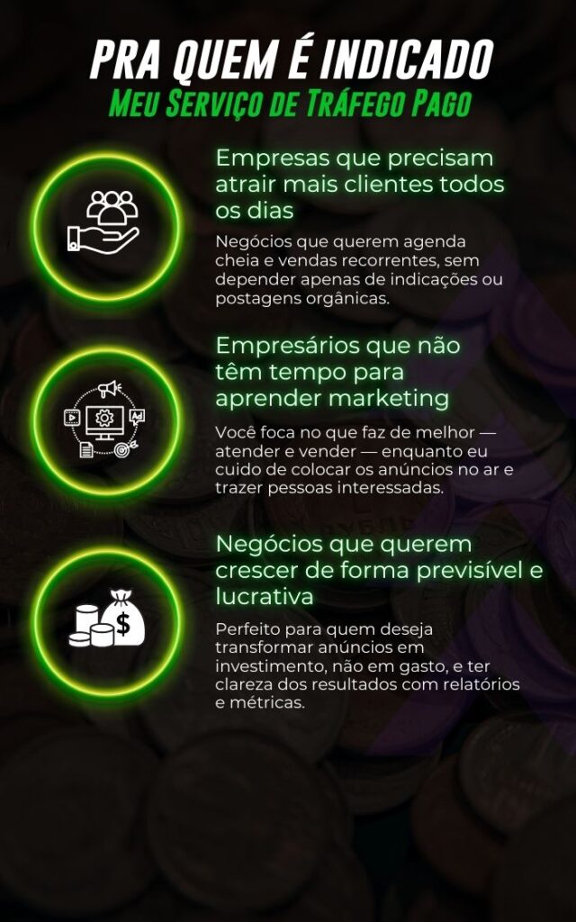 Não! Você foca no que faz de melhor — atender e vender — e eu cuido de toda a parte técnica de criar, gerenciar e otimizar seus anúncios para trazer clientes prontos para comprar.